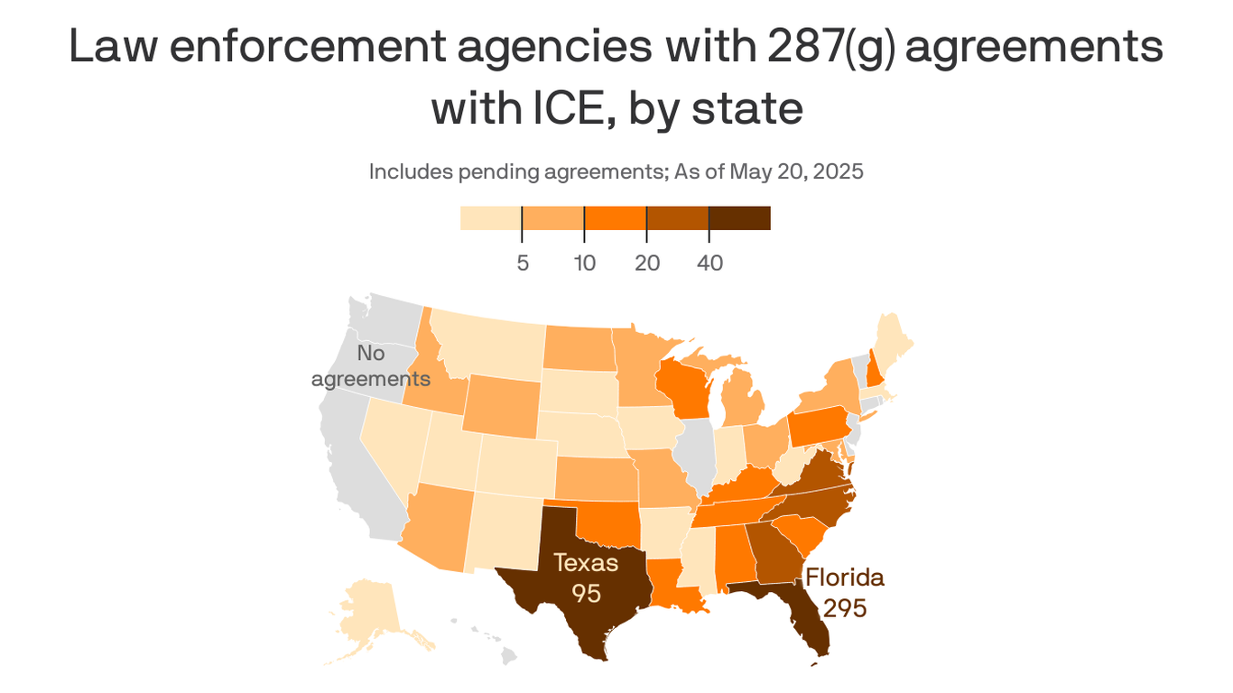 The big picture: The data analyzed by Axios and the locations of the agreements between the federal government and the local authorities reflect some simple truths about the enforcement of immigration in the USA
